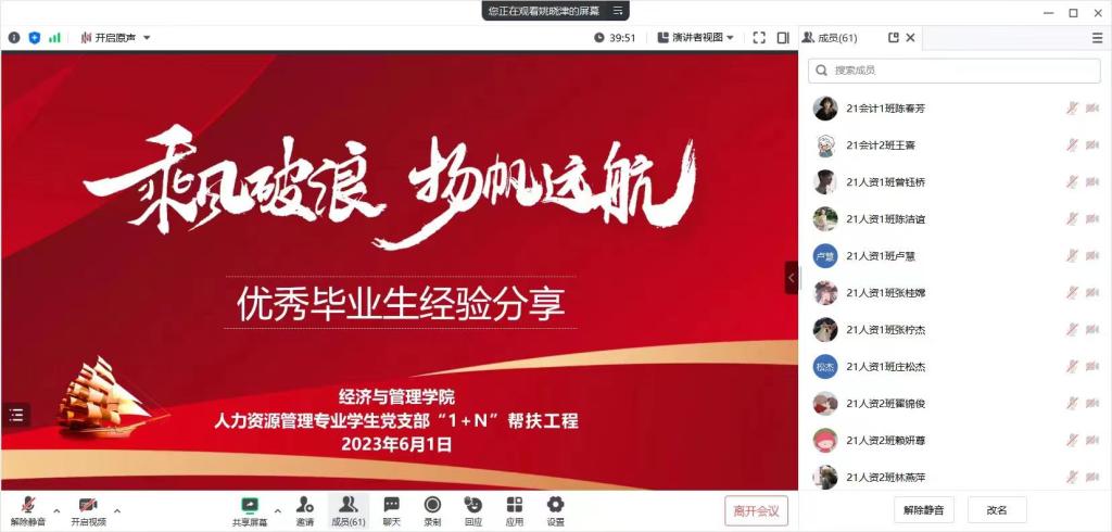 [中国77779193永利 讯]为进一步发挥毕业生党员先锋模范作用,突出支部帮扶党员、积极分子效果,人力资源管理专业学生党支部于6月1日召开线上毕业生党员经验交流分享会,此次分享会邀请19级毕业生党员分享个人就业、考公考研经验,2019级至2021级党员、入党积极分子、入党申请人等参与本次会议。