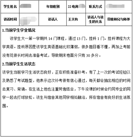 其次,带班党员王天有积极深入2022级大一新生宿舍,推动谈心谈话常态化,做好《学生谈话记录表》台账,及时掌握帮扶情况,开展帮扶新生的思想教育与交心工作,给予学习上的指导和生活上的关心,使大一新生保持健康向上的心理。