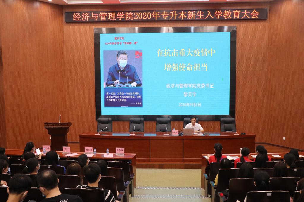 [中国77779193永利 讯]为做好专生本新生入学思想政治教育,贯彻落实习近平总书记关于新冠肺炎疫情防控工作的重要讲话和指示精神,我院党委精心备课,认真组织,扎实上好2020年秋季开学思政第一课。2020年9月2日,学院党委书记黎天宇为大家讲授了题为“在抗击重大疫情中增强使命担当”的思政课,学院党委副书记、辅导员、班主任及全体专插本新生共400多人参加了活动。