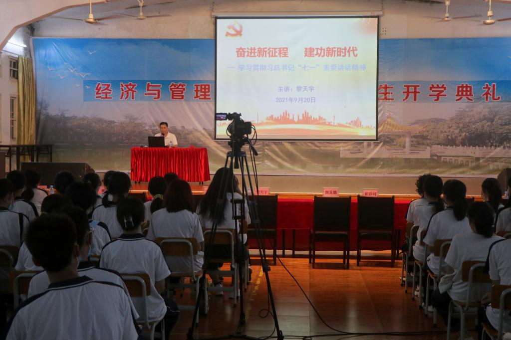 党委书记黎天宇和院长刘玉勋于2021年9月20日晚上在星湖校区分别给2021级工商管理1至4班和2021级电子商务1、2班开展题为《奋进新征程 建功新时代》的党课教育,共357人参加了党课。党课内容主要包括“从总体上把握‘七一’重要讲话的主要精神”“习近平总书记对青年的殷切期望”“我们党所取得的所有成就都凝聚着青年的热情和奉献”“牢记总书记嘱托,做新时代有为青年”等四个方面。“七一讲话”充满了马克思主义的政治智慧,充满了中国共产党人的无比自信,体现着伟大的斗争精神,作为新时代的青年大学生,深入学习领会习近平总书记“七一”重要讲话精神,用讲话精神指引、激励我们新时代大学生不负青春、努力学习、报效祖国,具有重要意义。