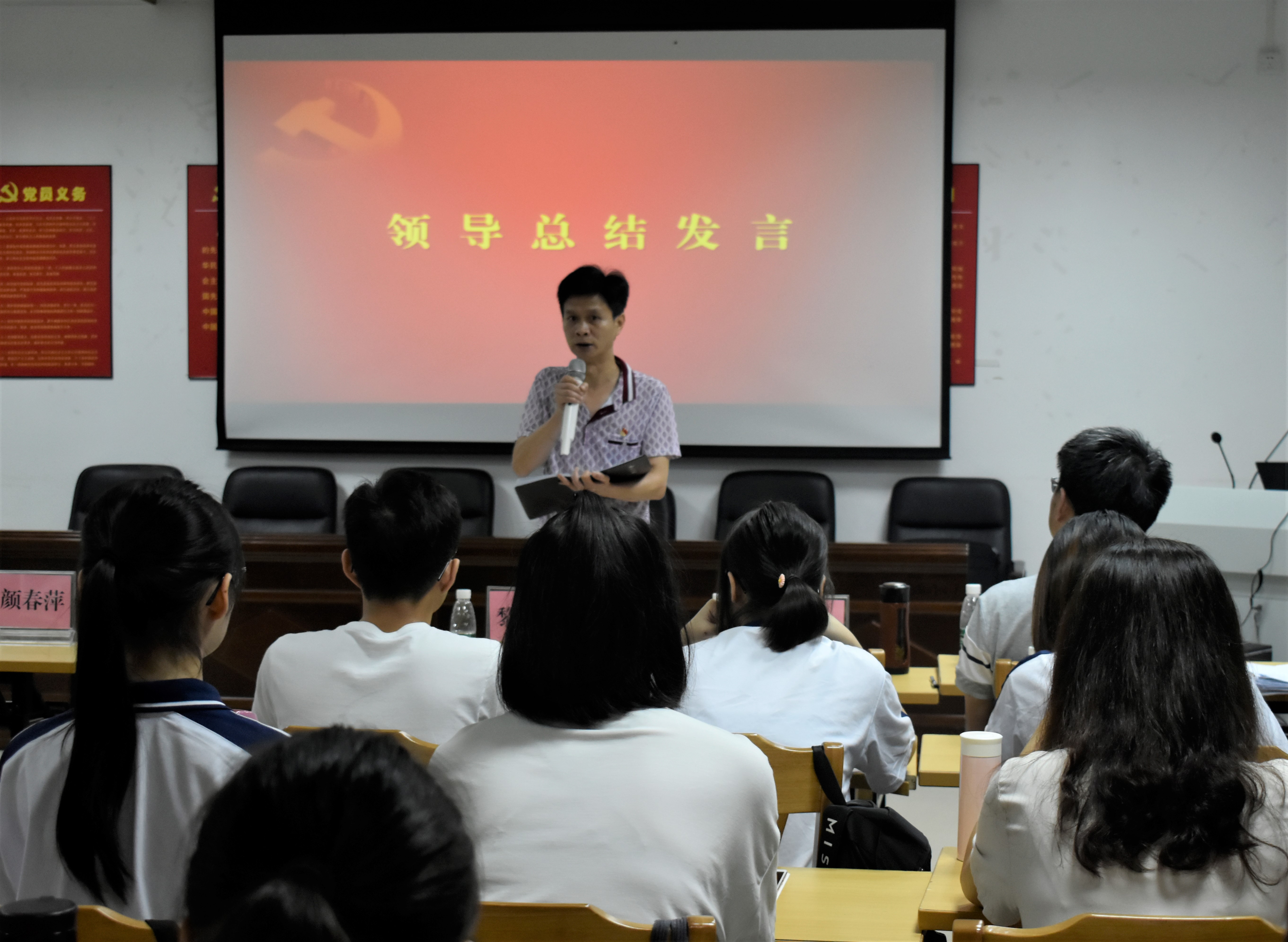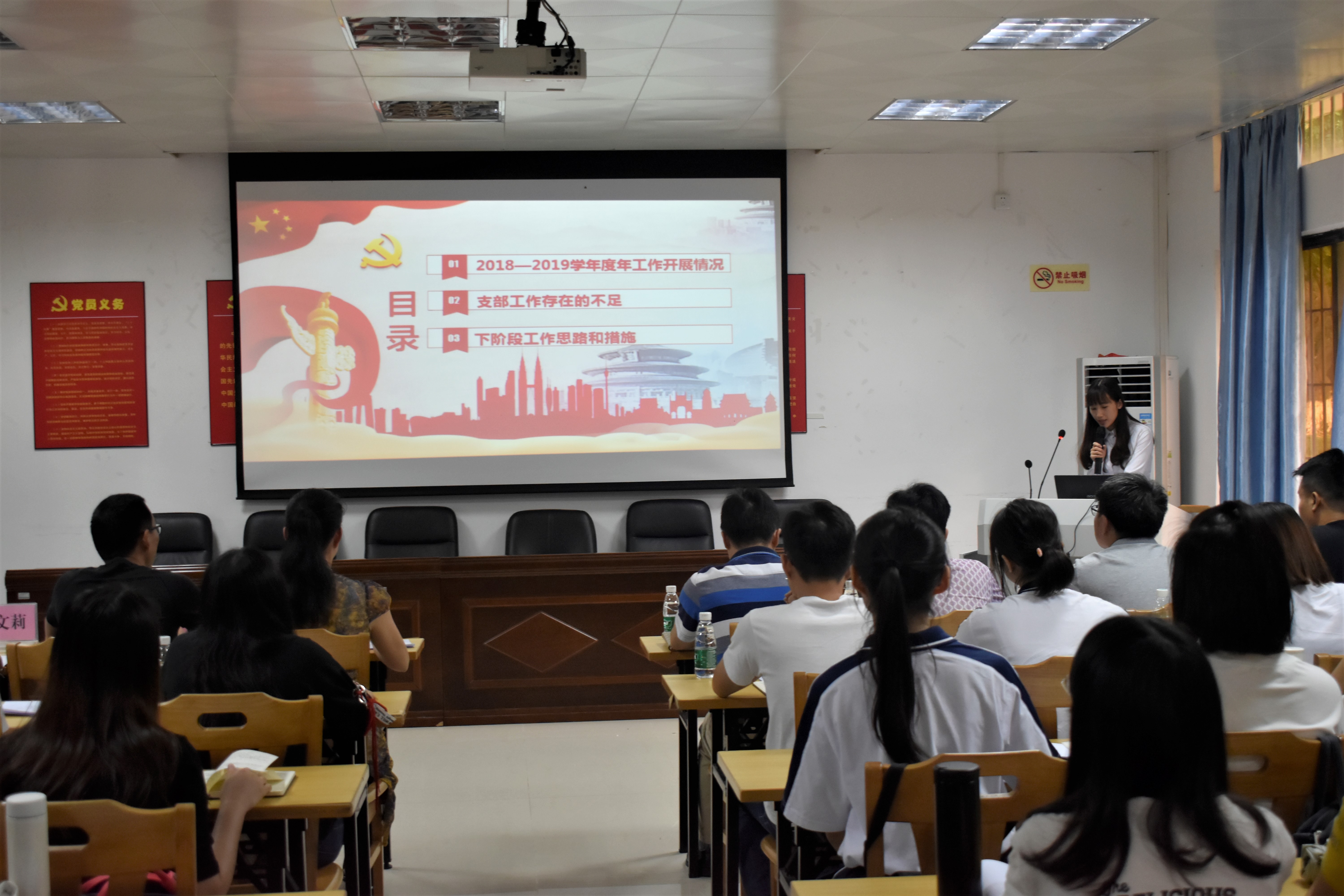 出席会议的有学院党委书记黎天宇,学院党委副书记颜春萍,学院党委委员、副院长雷洪,学院党委委员邓孙棠,学院辅导员张鹏军、温文莉、董濠鋆和卢若蒙以及各学生党支部委员、各学生党支部参评人员及 2019 年上半年新发展的预备党员。