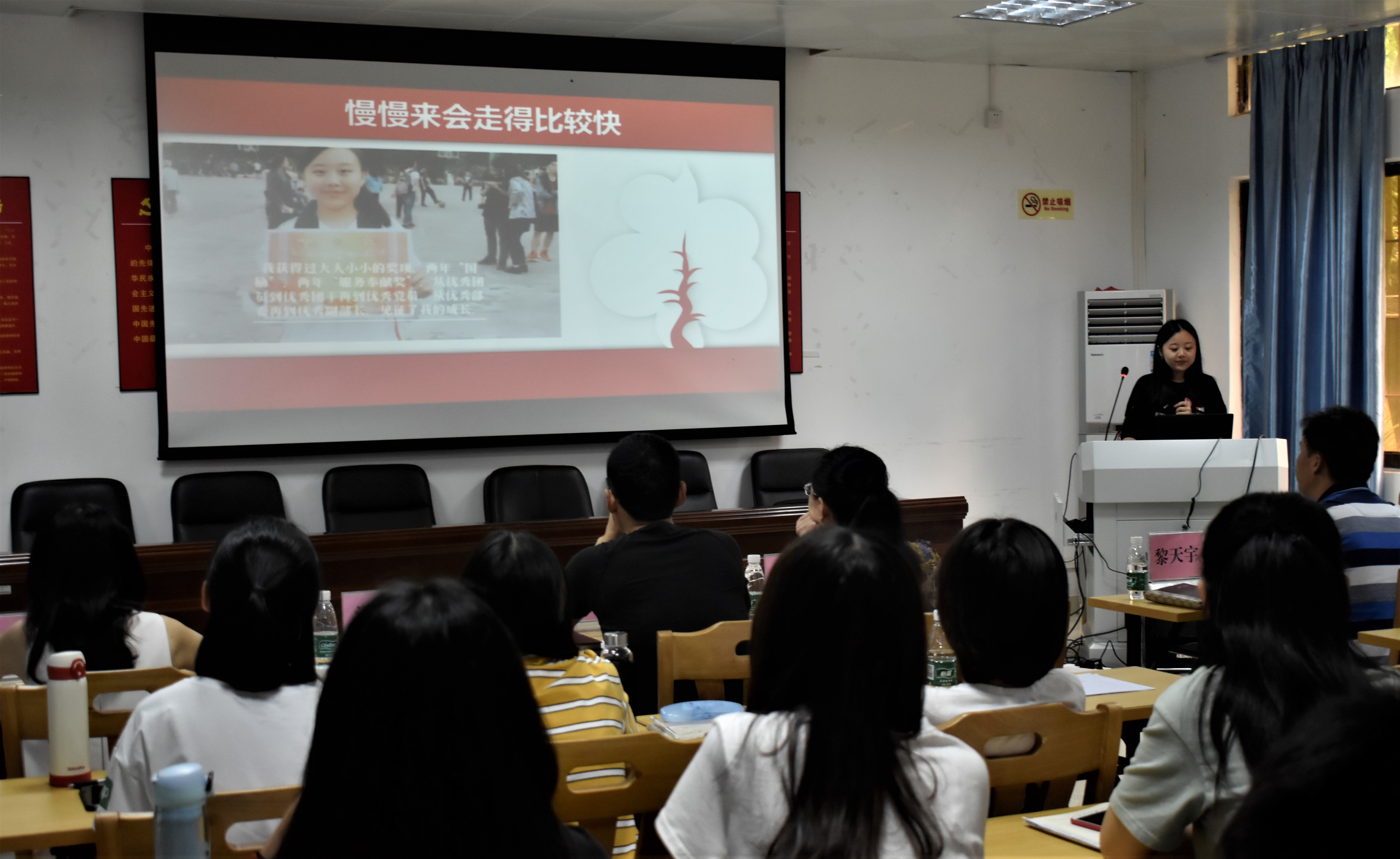 先进学生党支部评选结束后,跟着进行“十大锋范学生党员”评选。15名候选人们按照赛前抽签顺序依次上台,同样是通过PPT展演的方式,声情并茂地向大家展示了自己作为一名优秀学生党员在专业学习、工作作风、个人生活、遵纪守法、荣誉奖励等方面的先锋模范引领作用。评委按评分规则评出得分最高的10人公示无异议后,将获得学院2019年“十大锋范学生党员”荣誉称号。