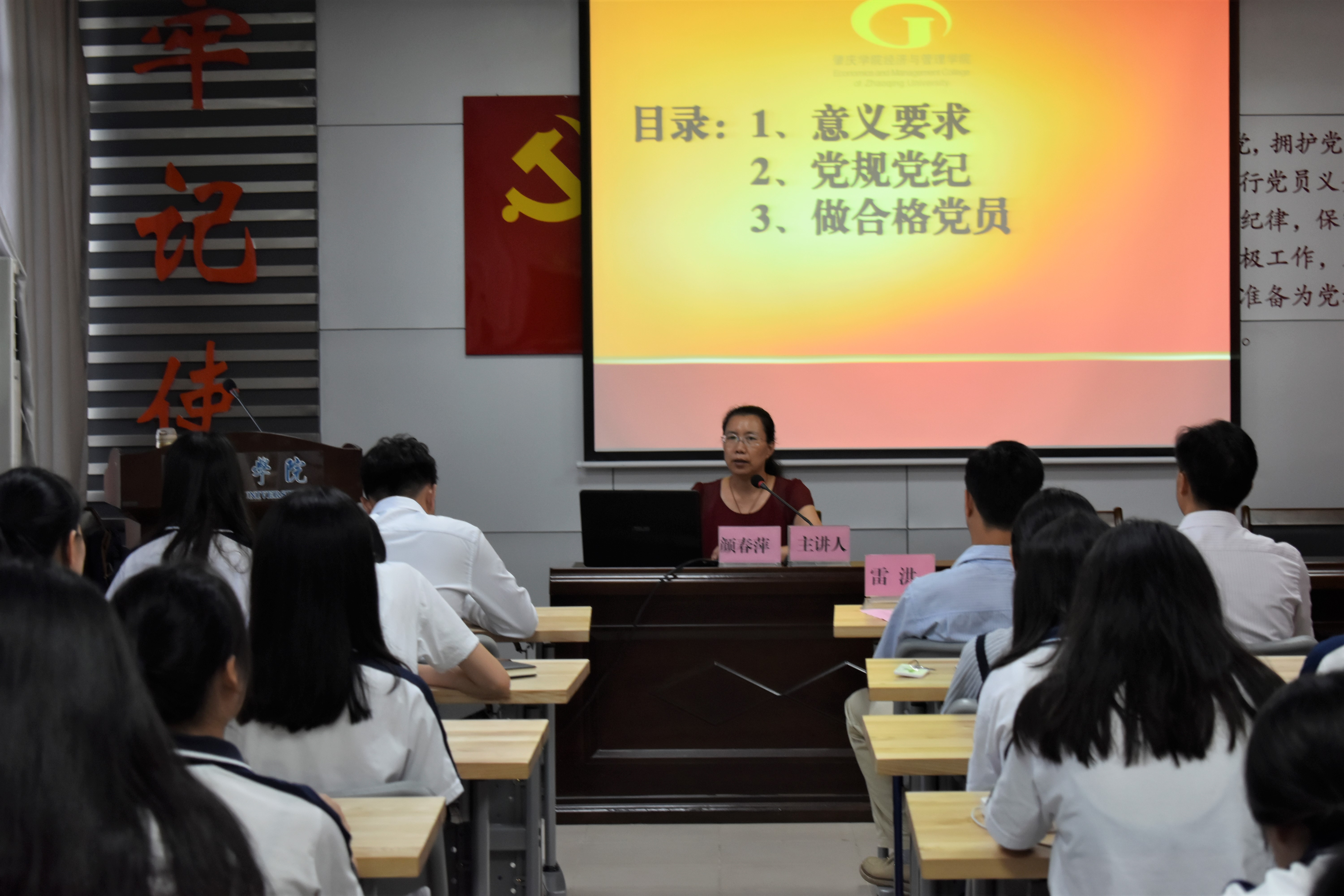 学院党委副书记颜春萍同志上了题为《学习党规党纪,做合格党员》的党课教育。她从“加强思想理论学习”、“坚持民主生活会”和“不忘初心、牢记使命,做新时代合格党员”三方面进行学习教育,希望党员同志们要以党员标准严格要求自己,规范自身的言行,进一步进行个人党性分析,自我批评以及发现自身的问题并整改。要求党员要发挥模范带头作用,加强理论学习,主动参加社会实践、服务社会、服务群众工作,不断提升个人党性修养。(编辑:张鹏军)