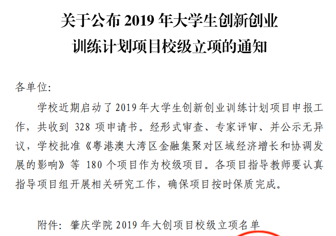 5月17日,学校下发了《肇学院42号肇庆学院关于公布2019年大学生创新创业训练计划项目校级立项的通知》,我院2019年大创立项数达到17项,是历年来的新高,申报成功率达到58.6%(17/29)。