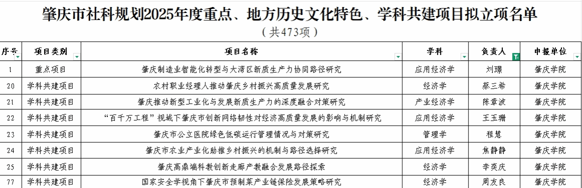 祝贺刘璟主任、蔡三希博士、陈章波副教授、王玉珊博士、程慧副教授、焦静静博士、李奕庆老师、周友良主任获得肇庆市社科规划2025年度重点、地方历史文化特色、学科共建项目拟立项。
