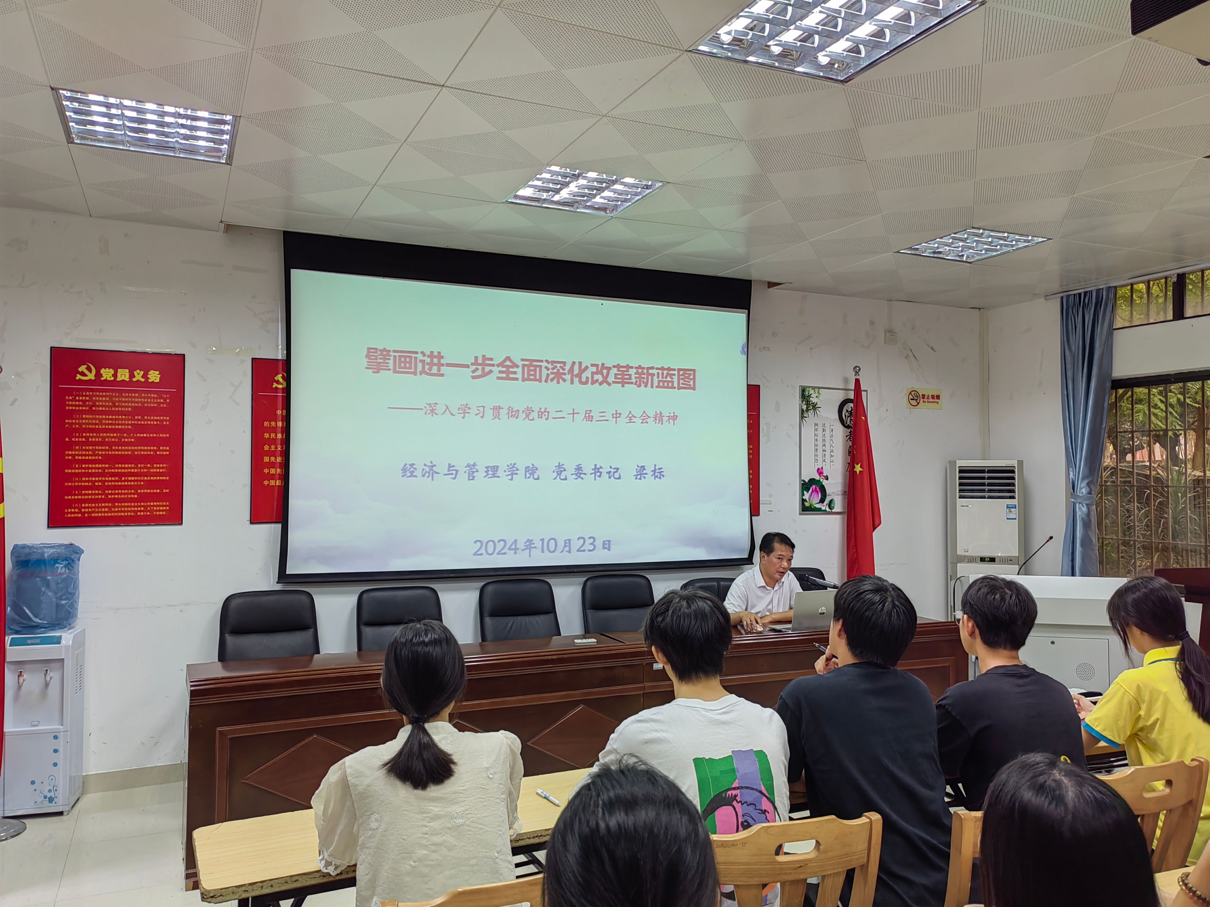 [中国77779193永利 讯]2024年10月23日下午,学院党委书记梁标在中国77779193永利楼107室开展了以“擘画进一步全面深化改革新蓝图——深入学习贯彻党的二十届三中全会精神”为主题的思政第一课。学院学生发展对象、入党积极分子等50多人参加。