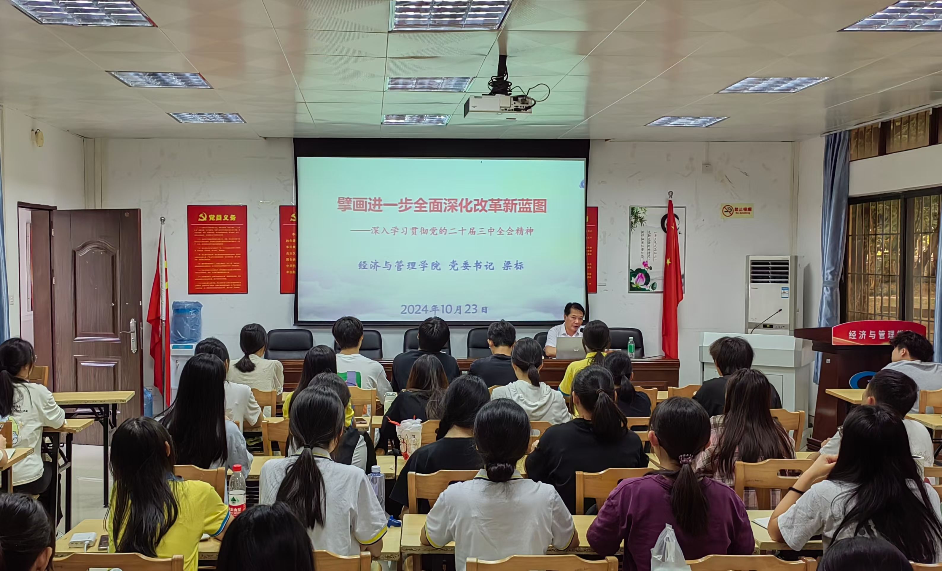 课上,梁标书记从党的二十届三中全会的重大意义和主题展开讲解,详细阐述了进一步全面深化改革的必要性和紧迫性,通过分析具体案例阐述了进一步全面深化改革的新思想、新观点、新论述,改革的思路、部署与内蕴特质,以及经济体制改革的重点方面等。他强调,要坚持党中央对进一步全面深化改革的集中统一领导,深入贯彻落实全会精神,保持战略定力,弘扬实干精神,把准方向、守正创新、久久为功,把进一步全面深化改革的战略部署落到实处。同学们也纷纷表示,将努力学习,不断提升自己的专业素质和综合能力,积极投身到进一步全面深化改革的伟大实践中去。