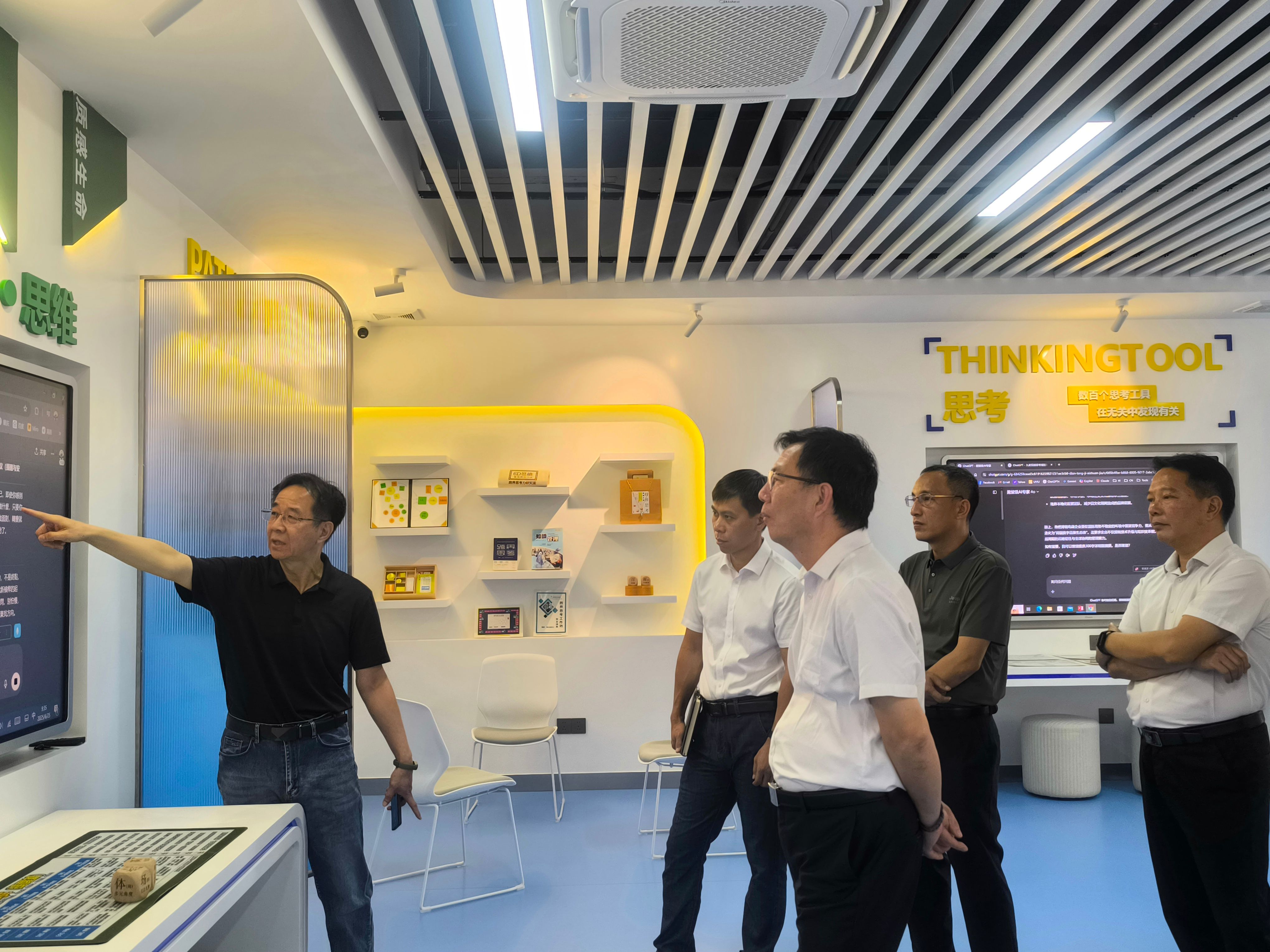 谢冠华一行首先来到交叉创新研究中心展示厅实地观摩考察。陈永隆博士全面详细中心展厅的主题区、知识区、思考区、思维区、未来教育区和元宇宙区等功能区,逐一展示了中心的研究成果与未来的学术方向。主题区通过影片与智能语音助理展示研究中心的愿景与成果;知识区汇聚38门课程讲义与线上教学资源;思考区重点介绍十套原创AI模型;思维区则融合“6D思维”,关注学生心理疏导;未来教育区构建基于九大模型的教育路径;元宇宙区实现沉浸式跨区域教学。另设立了柔性屏与Miro互动区,提升创新与协作效率。