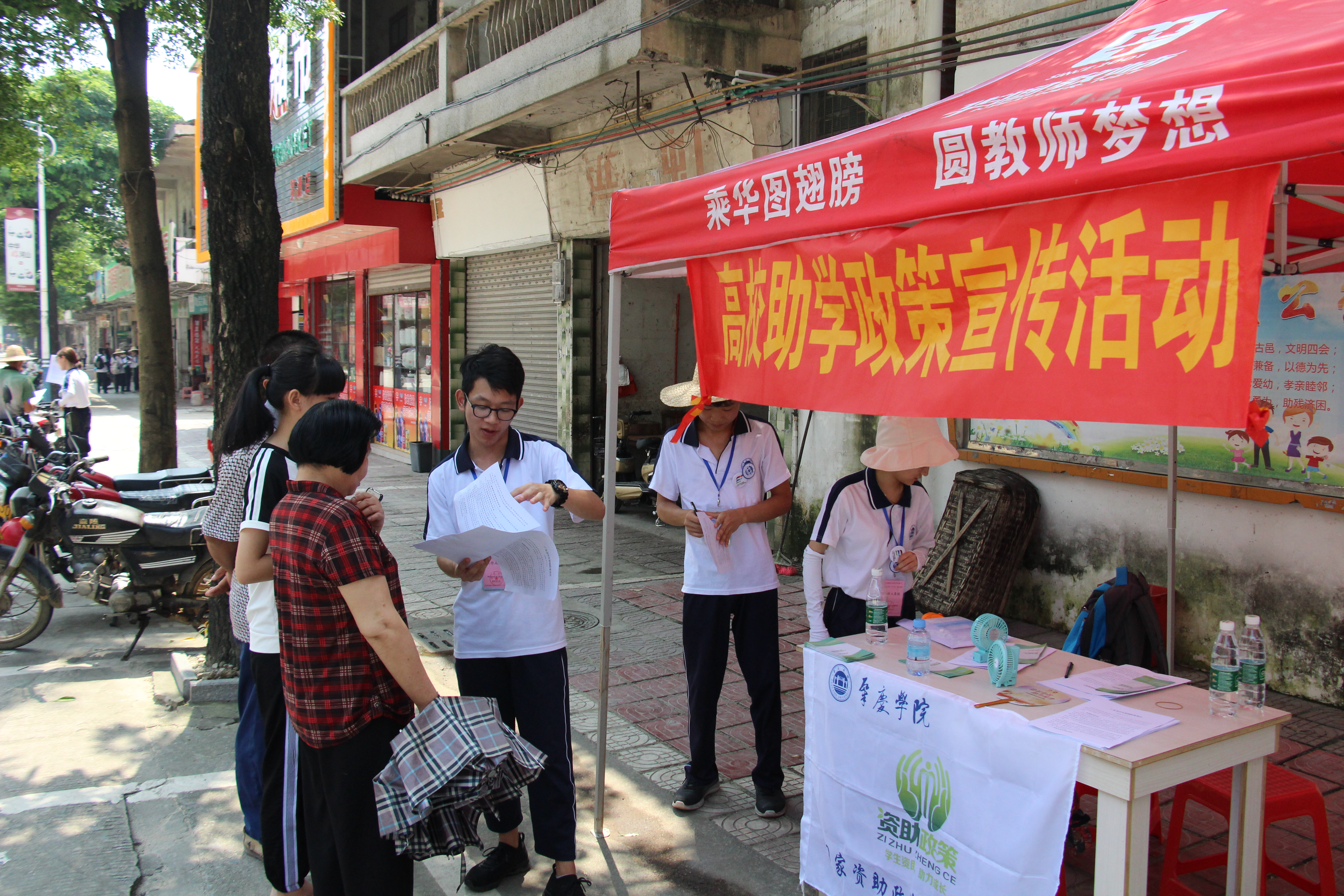 摆摊宣传期间,由温文莉老师和卢若蒙老师负责带领第三小组进行摊位宣传,第一小组和第二小组负责到附近的商户进行走访宣传。此次宣传,主要以“广东省国家助学贷款”为依托,涵盖研究生国家奖助学金、本专科生国家奖助学金、国家助学贷款、广东省家庭经济困难大学新生资助、广东省少数民族聚居区少数民族大学生资助、南粤扶残助学工程、学费补偿和国家助学贷款代偿政策和学校资助措施这八大方面进行普及宣传和问卷调查。经过队员们的分工合作和对群众耐心讲解,为不熟悉、不了解国家助学政策的广大群众答疑解惑,为农村贫困家庭学子读书上学提供了一个新的渠道。