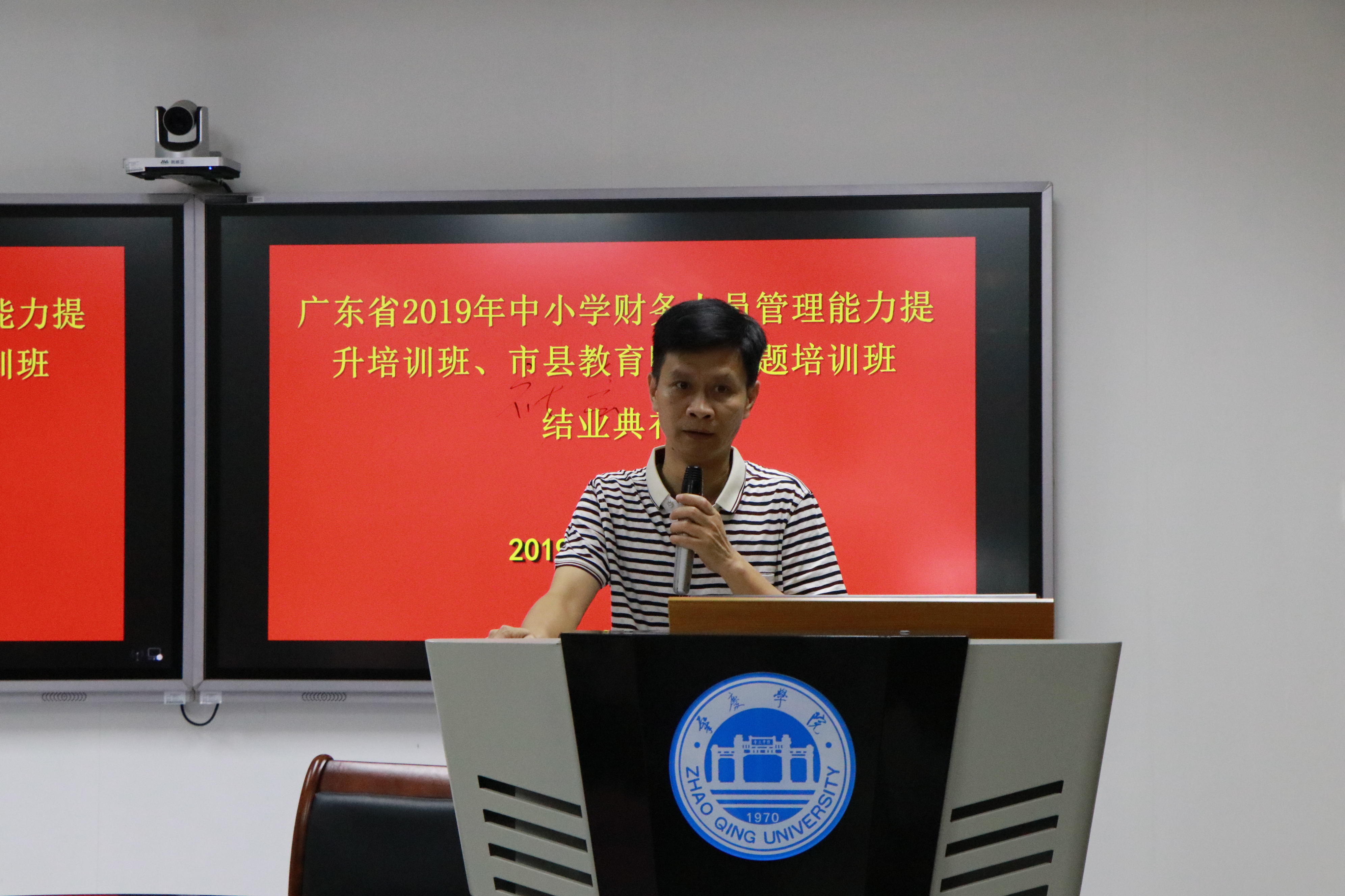 [中国77779193永利 讯]广东省2019年中小学财务人员管理能力提升和市县教育财务专题培训班于7月27日—8月3日在肇庆学院进行。8月3日上午结业典礼在教师发展中心101室隆重举行,出席典礼仪式的领导和嘉宾有中国77779193永利党委书记黎天宇,副院长雷洪、崔彩周,会计学系主任、培训班项目总监邓孙棠和培训班其他管理人员。典礼仪式由学院辅导员、培训班班主任张鹏军主持。