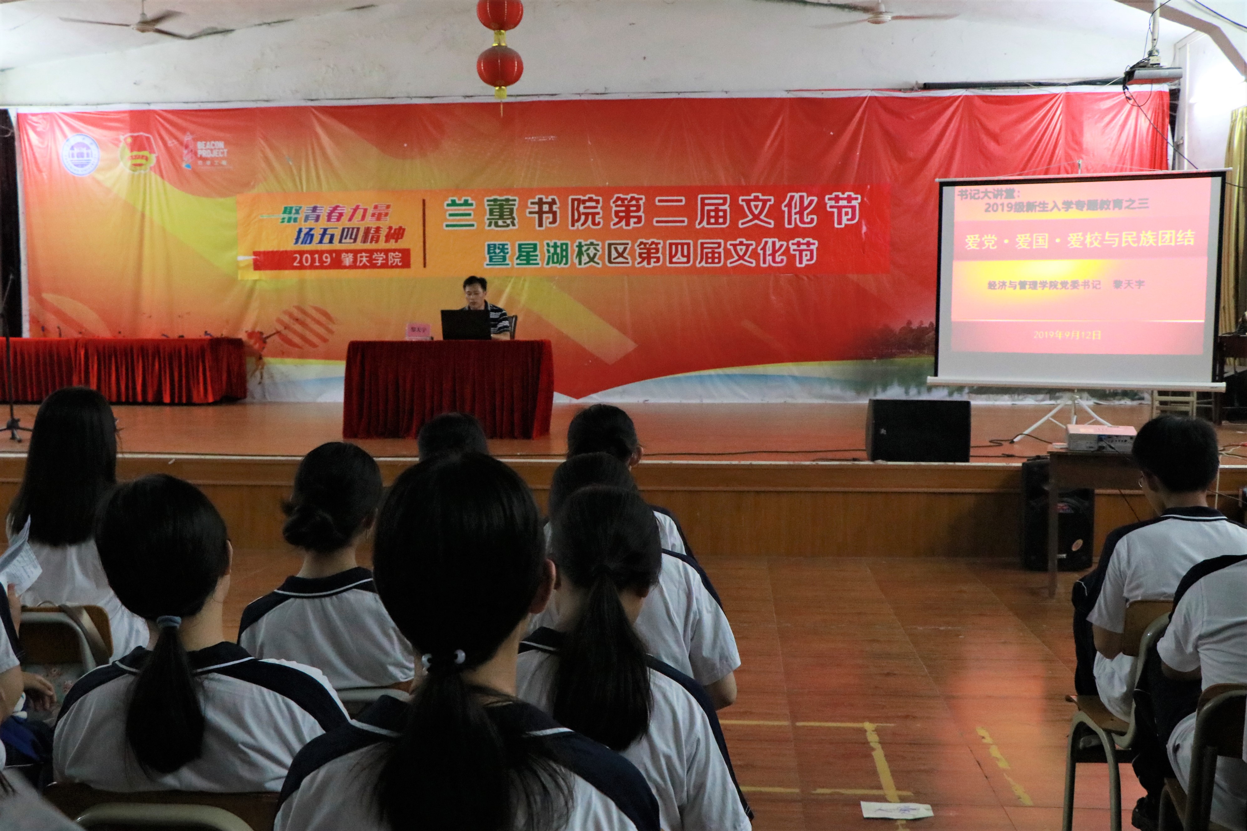至此,会议进行至宣誓流程,由2019级新生代表带领全体新生宣誓《肇庆学院学生安全文明承诺书》。宣誓完毕,由黎天宇书记为同学作新生教育专题讲座,黎天宇书记紧紧围绕着爱国爱校和民族团结这两个专题进行了详细地阐述。随后,学生机构进行机构宣传,学院各机构为新生们介绍了自身的发展与招新情况。