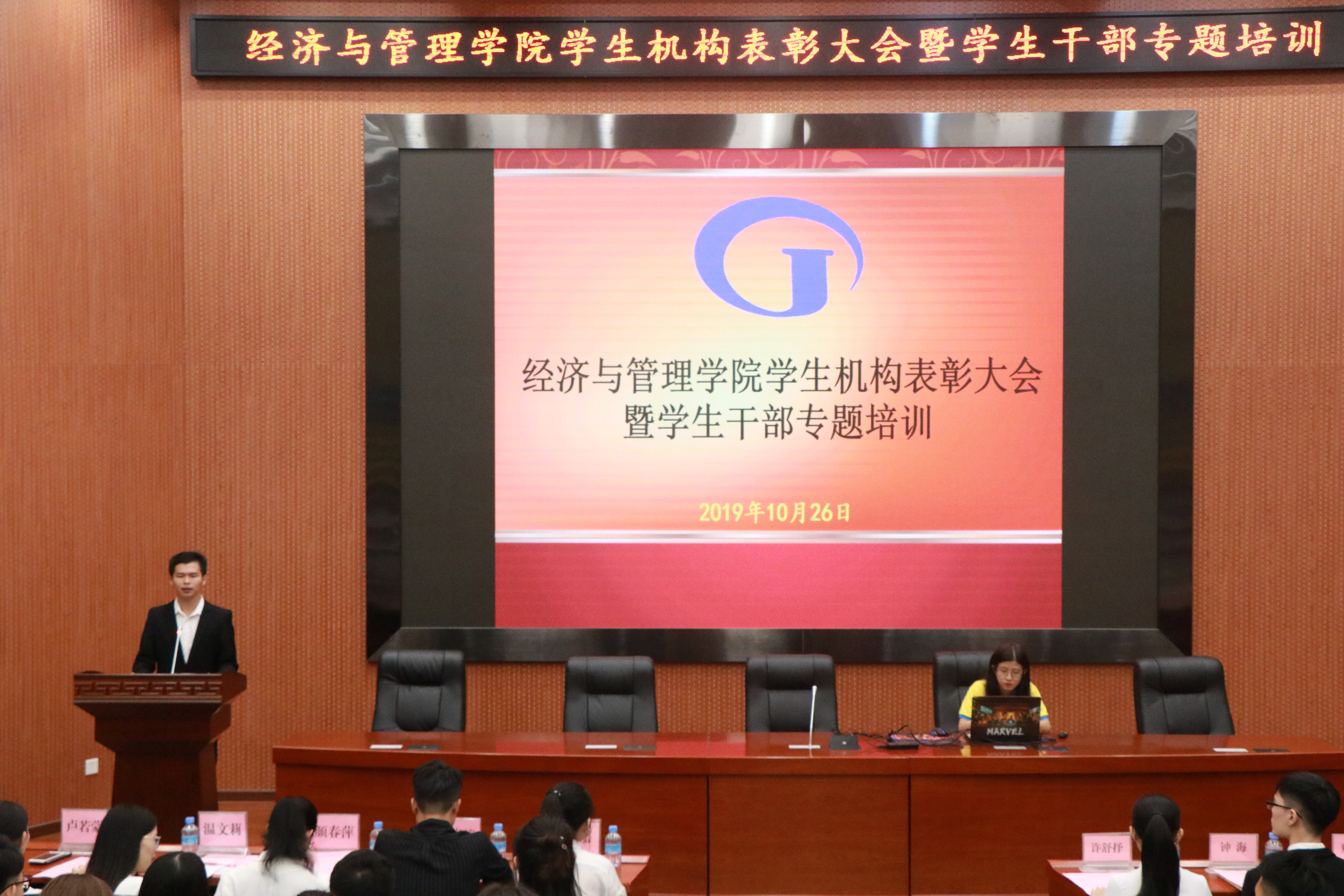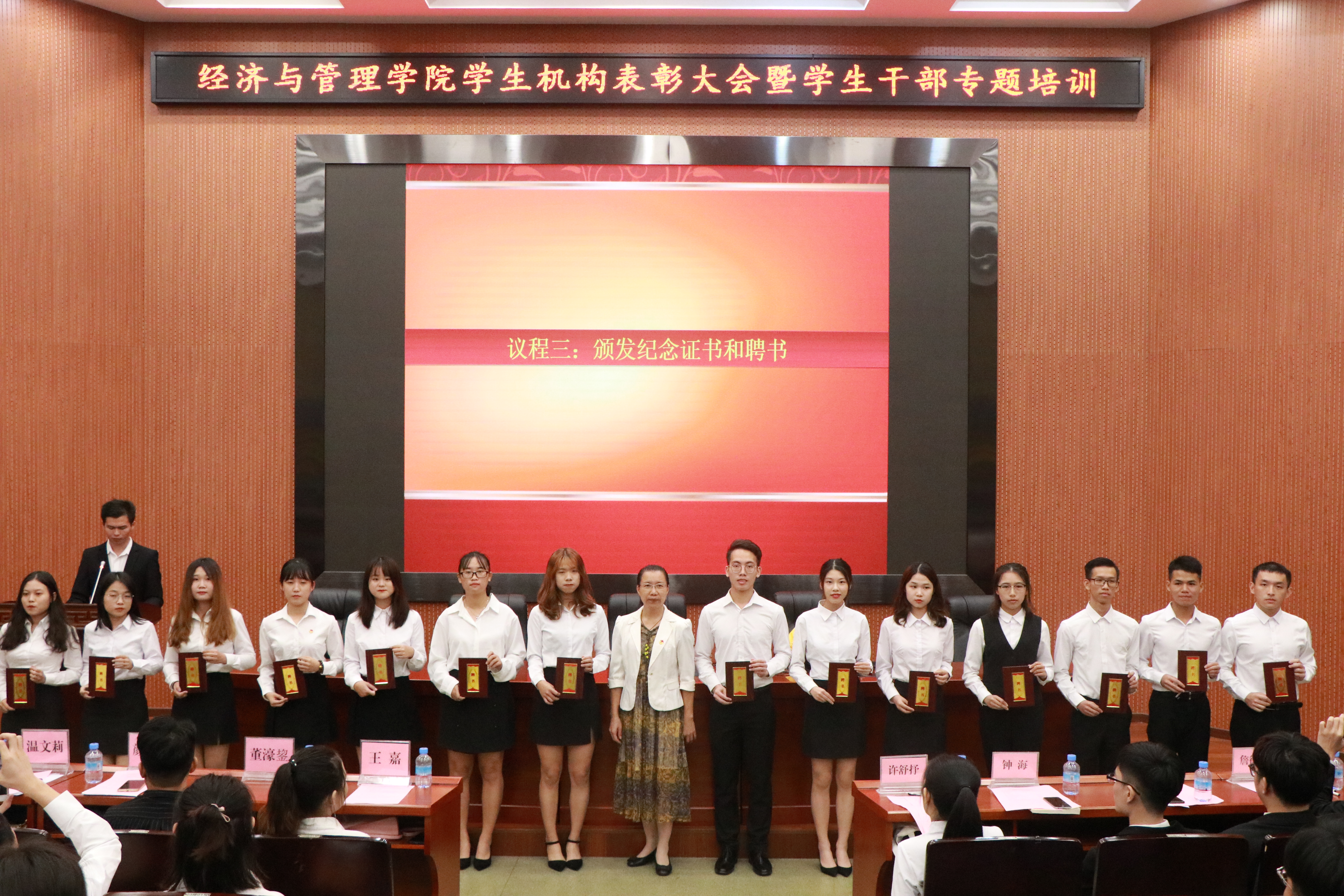 大会在主持人车嘉斌的致辞下拉开了序幕。会议首先由学院学生机构的相关负责人许舒抒、吴伊丹、钟海、夏宜楷、詹德森、陈思汝等先后作上一年学生机构工作报告。随后,在学院团委书记、辅导员温文莉宣读先进个人表彰和聘任决定后为优秀学生机构干部和退任干部颁发荣誉证书和纪念证书,为新一届学生机构负责人颁发聘书。接着,学生代表学生会主席文惠如对上学年工作做了总结,并对新一届提出几点建议,建议指出学生机构做事要讲求效率、脚踏实地,并真正做到学以致用。最后,校学生会主席罗志成对退任人员表示感谢,以及对新一任学生会干部的希望。最后与会全体成员合影留念。