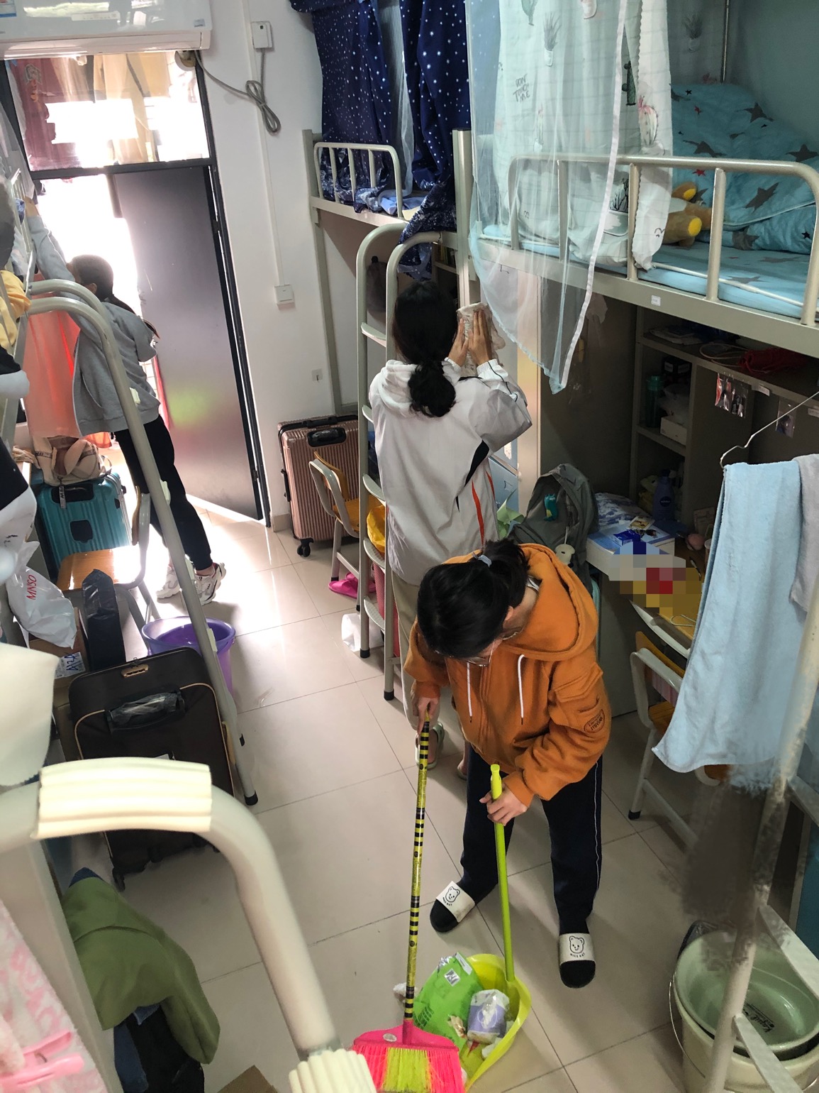 学院组织学生返校后首先开展宿舍清洁工作,清扫宿舍桌面积尘、打包剩余垃圾、铲除阳台周边等蚊虫遗留物,整顿个人内务、注意消毒卫生、宿舍勤通风;学院领导及辅导员深入学生宿舍检验清洁工作成果,与学生强调疫情防控重要性,目前仍不可掉以轻心;班主任组织班级成员开展主题班会,进一步加强宿舍卫生及消防宣传工作,督促培养学生养成良好的卫生生活习惯,营造健康安全的宿舍环境。