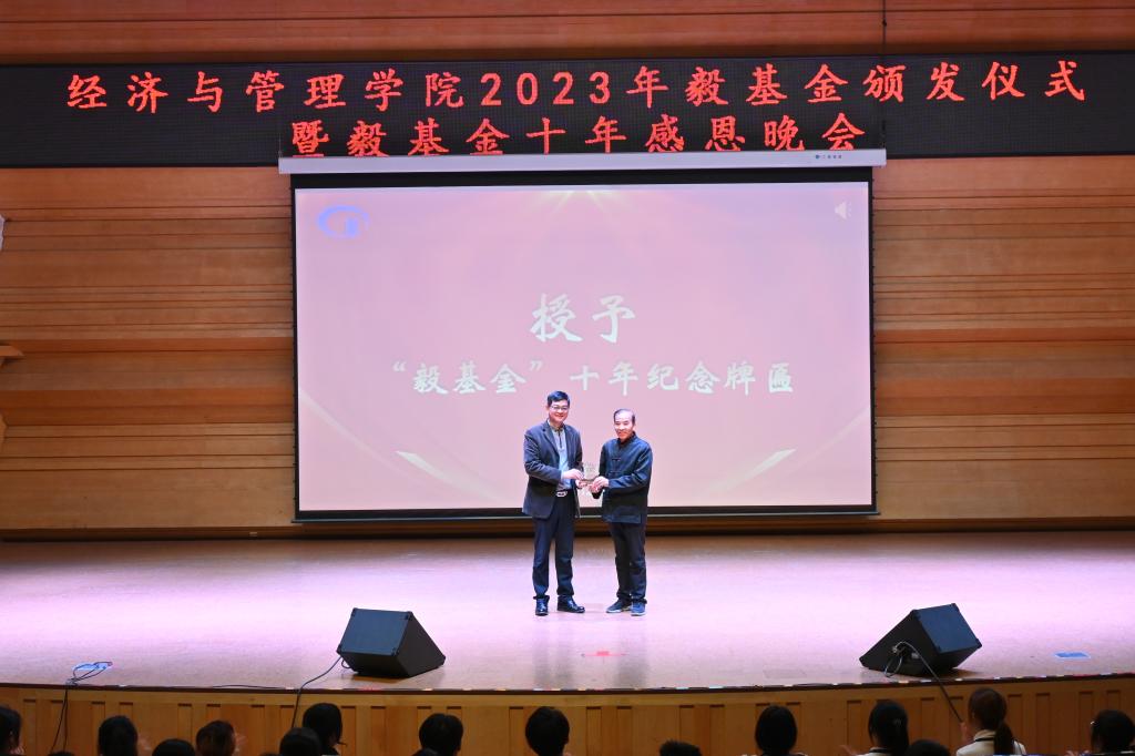 在颁发仪式上,首先播放了毅基金十年的纪录片,用一段段温暖的视频、一张张珍贵的图片回顾毅基金十年资助路。随后,黎天宇书记代表学院作毅基金十年工作总结,感谢冯毅先生一直以来情系教育、关心寒门学子,为寒门学子们搭建了一座座爱心之桥。为感谢冯毅先生十年的爱心资助,副校长唐冬冬向毅基金代表、王中生先生颁发“毅基金十年纪念”牌匾。在感恩晚会上,师生同台演出,用舞蹈、声乐、器乐等表现形式,展现了一场高质量晚会。晚会在一首《感恩的心》中落下帷幕。