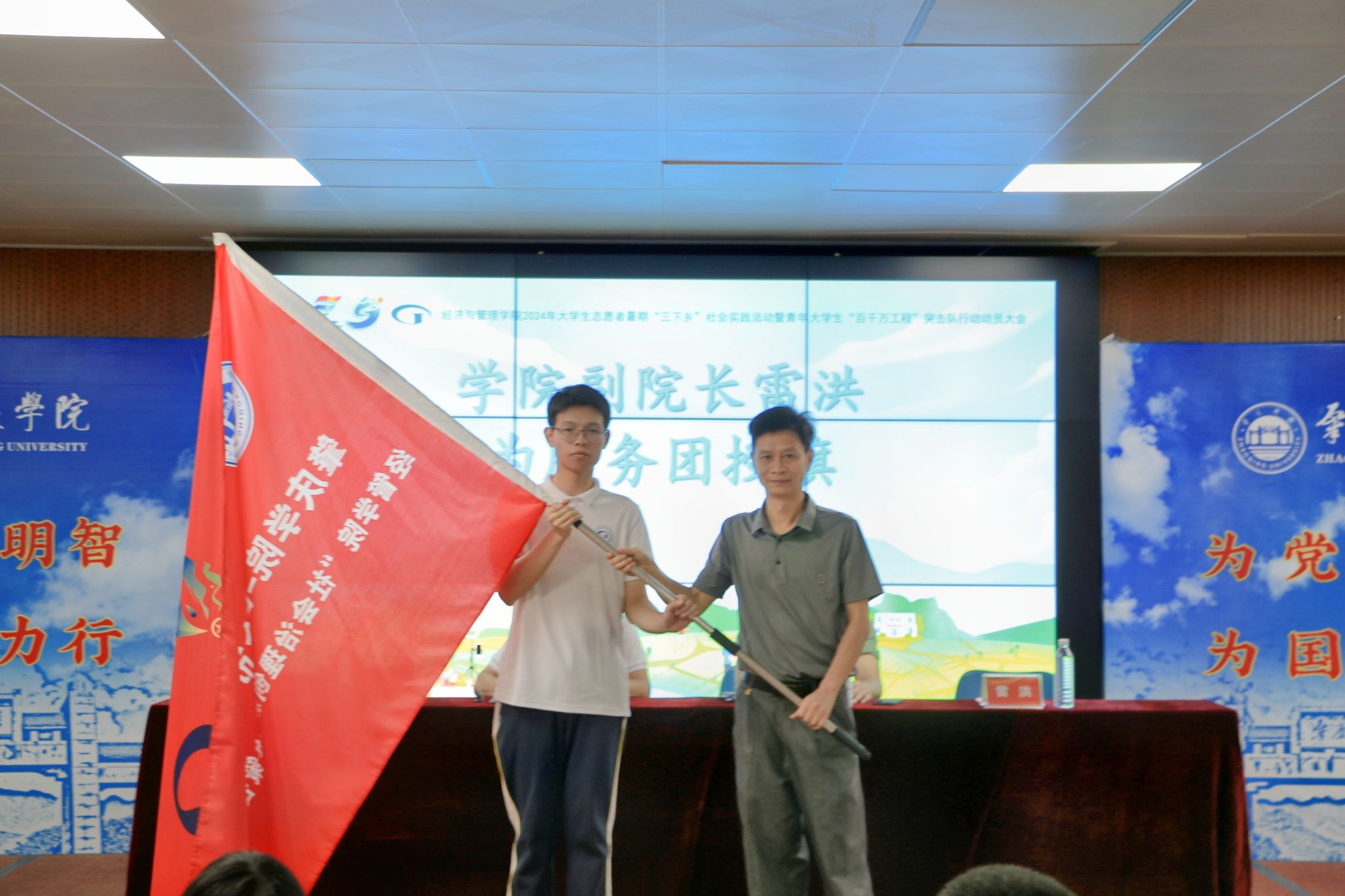 巫燕娜代表学院社会实践活动领导小组就队伍组建、活动筹备及目标要求等情况作了全面介绍,并提出实践活动的纪律和安全提出明确要求。随后,由学院副院长雷洪向各社会实践团队授旗。