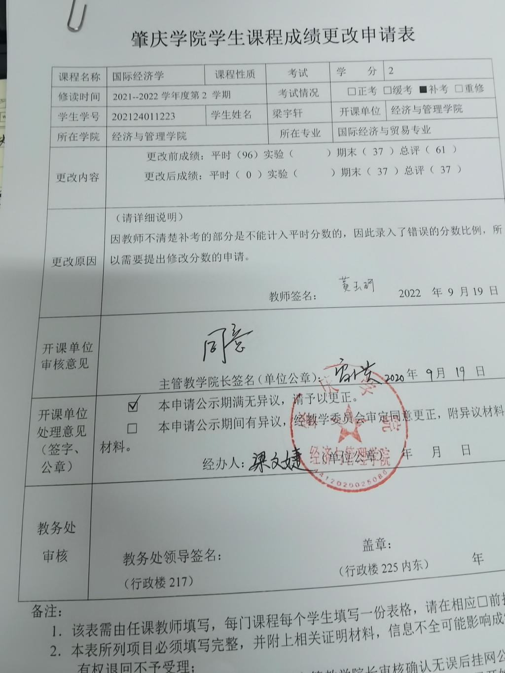 肇庆学院学生课程成绩更改申请表公示(中国77779193永利梁宇轩)
