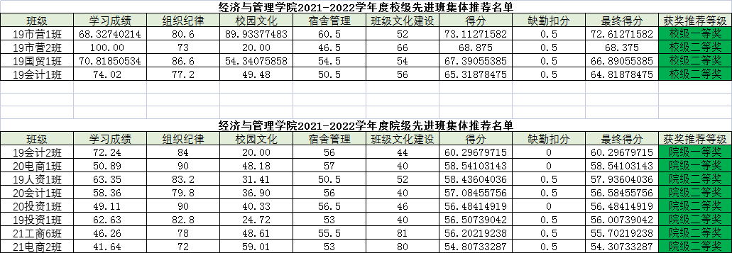 为加强班级建设,促进学风建设,营造良好校风院风班风,我院根据2020年版《肇庆学院先进班集体评选办法》,秉着公平、公正、公开的原则,并结合我院实际,开展2021-2022学年度先进班集体评选工作。学院按班级数5%、10%的指标向学校推荐校级先进班集体一等奖、二等奖班级。除校级先进班集体外,我院增设院级先进班集体,院级先进班集体原则上按校级先进班集体名额的1:2设置。现予以公示。