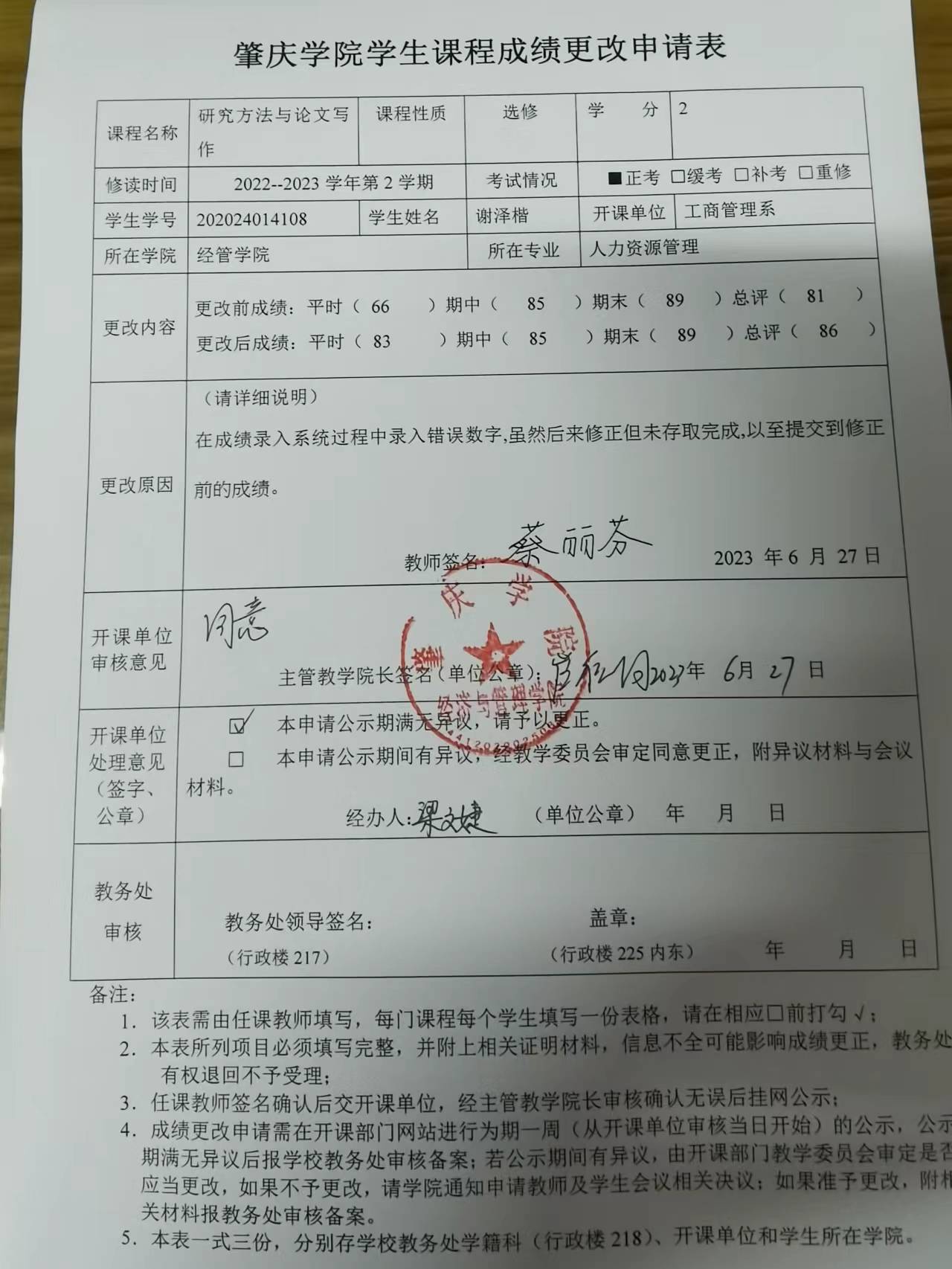 肇庆学院学生课程成绩更改申请表公示(中国77779193永利谢泽楷)