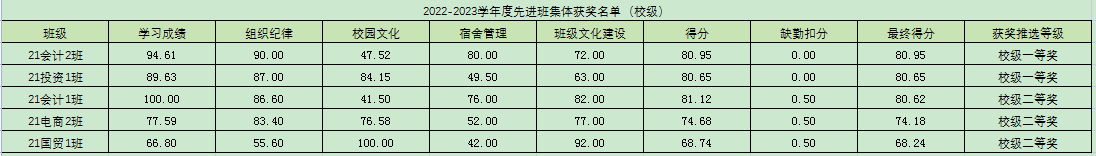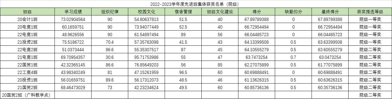 为加强班级建设,促进学风建设,营造良好校风院风班风,我院根据2020年版《肇庆学院先进班集体评选办法》(试行),秉着公平、公正、公开的原则,并结合我院实际,开展2022-2023学年度先进班集体评选工作。学院按班级数5%、10%的指标向学校推荐校级先进班集体一等奖、二等奖班级。除校级先进班集体外,我院增设院级先进班集体,院级先进班集体原则上按校级先进班集体名额的1:2设置。现予以公示。