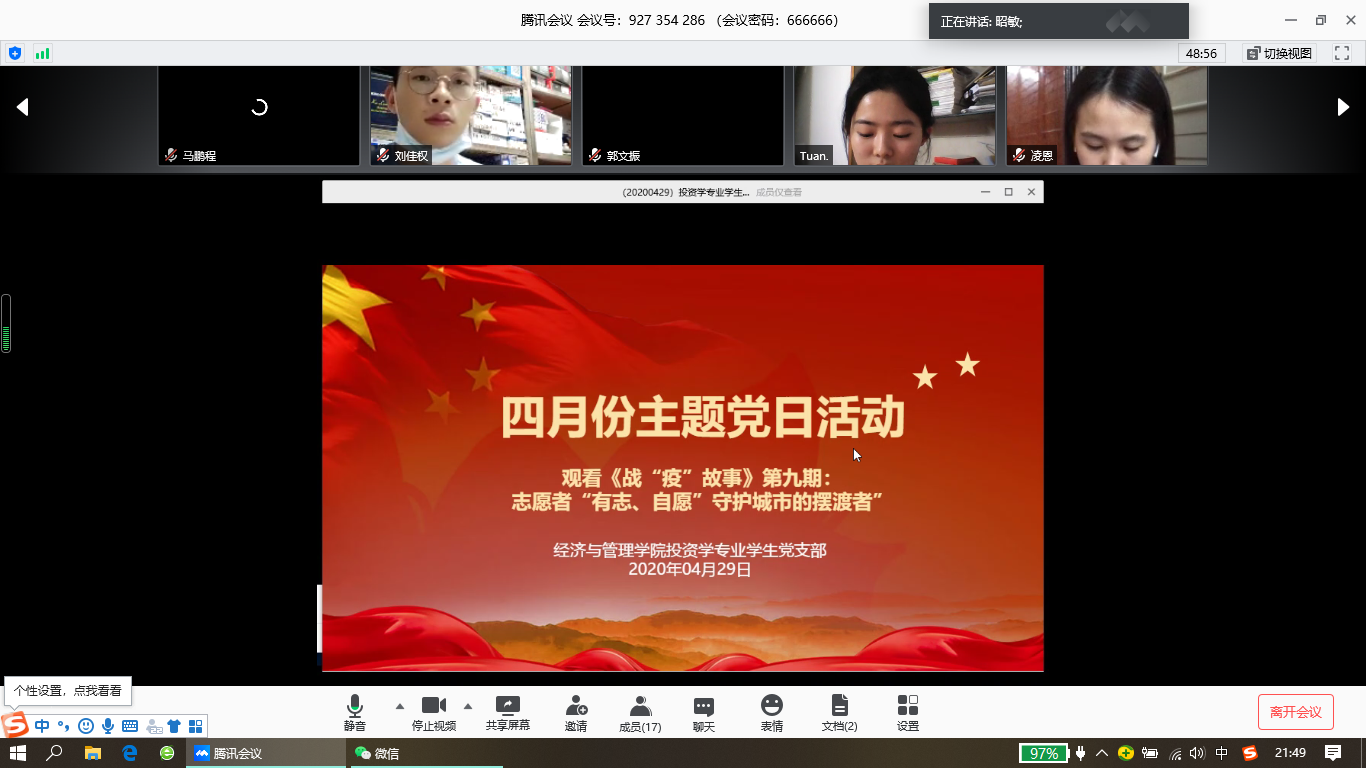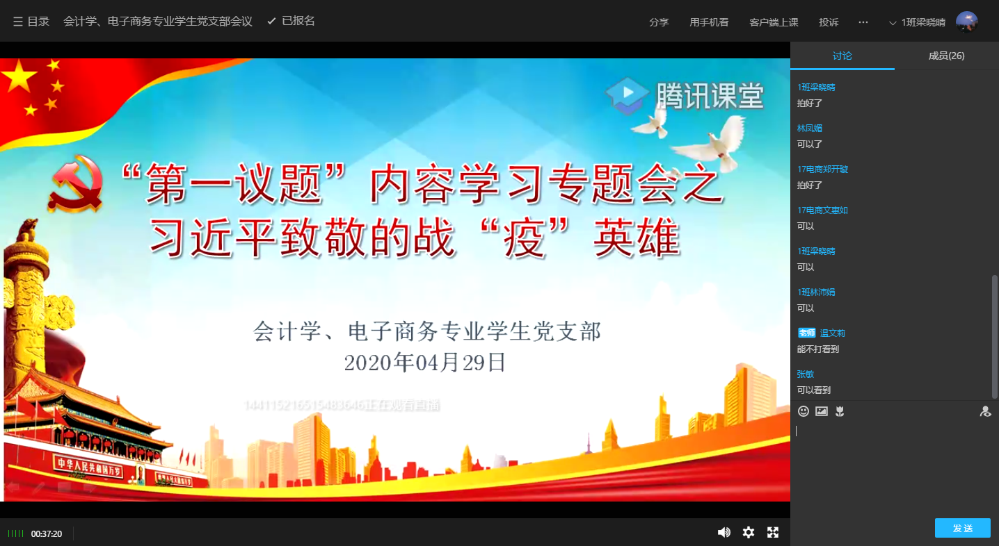 中国77779193永利五个学生党支部利用腾讯课堂或者腾讯会议平台集体学习了《习近平致敬的战‘疫’英雄”》,集体观看了《战“疫”故事》第九期:志愿者“有志、自愿”守护城市的摆渡者。战“疫”故事让人动容,战“疫”英雄让人敬佩。各位同学纷纷表示要向战“疫”英雄学习,发挥先锋模范作用,用实际行动践行初心和使命。