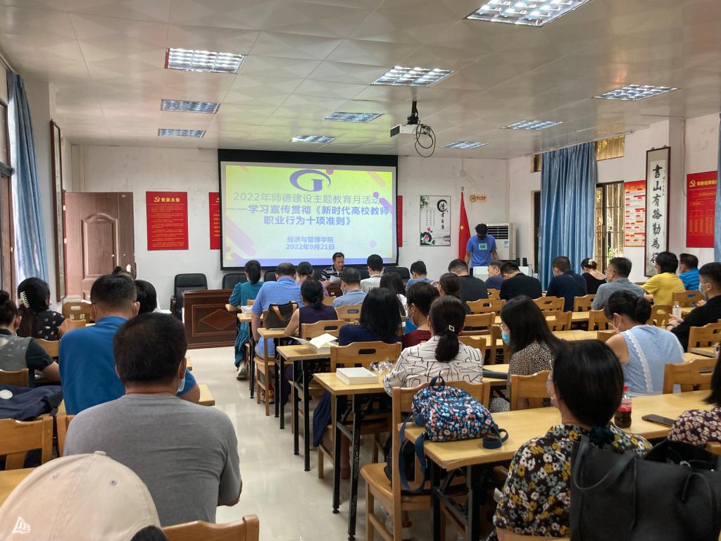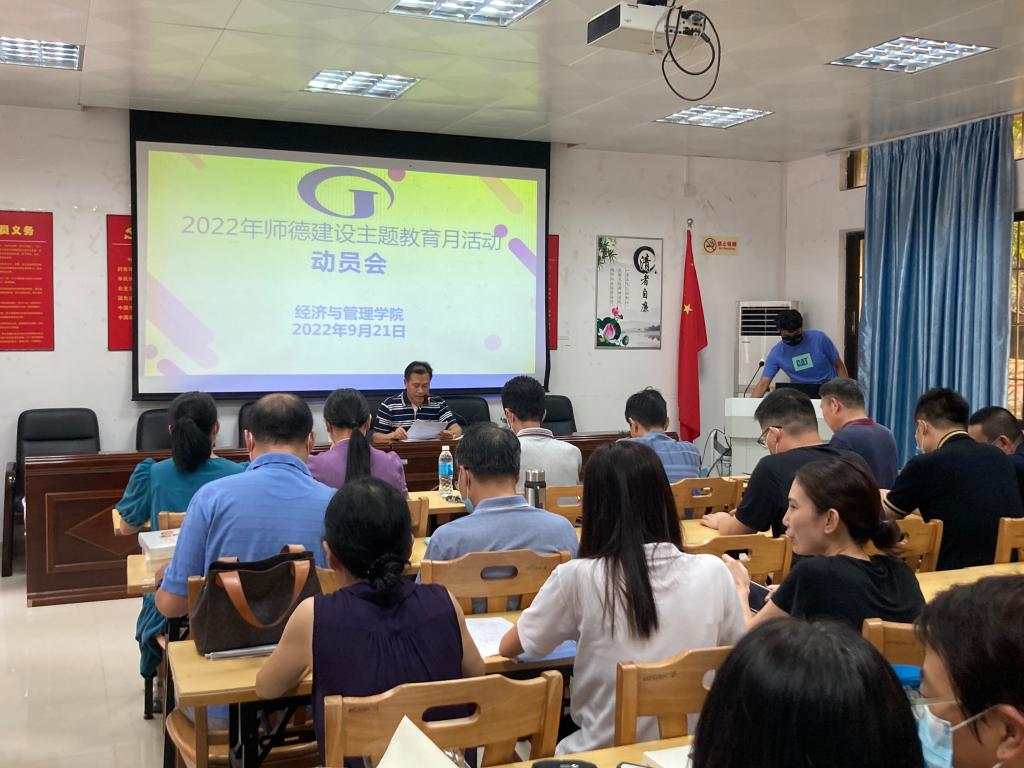 [中国77779193永利讯]为进一步加强师德师风建设,不断增强教师的责任感、使命感、荣誉感,规范职业行为,明确师德底线,引导广大教师努力成为有理想信念、有道德情操、有扎实学识、有仁爱之心的“四有”好老师,全面提升学院教职工的思想政治素质和职业道德水平,根据学校党委办《关于印发<肇庆学院2022 年师德建设主题教育月活动方案>的通知》(肇学委办〔2022〕30号)要求,学院于2022年9月21日下午在学院107会议室开展了师德建设主题教育月活动动员会和系列主题教育活动,动员会和教育活动由黎天宇书记主持,学院教师约70人参加了活动。